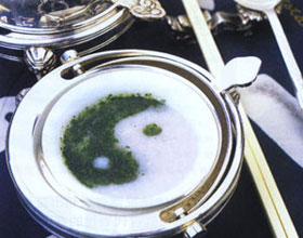 3.装盘后,用绿叶汁点缀成太极形状即可。